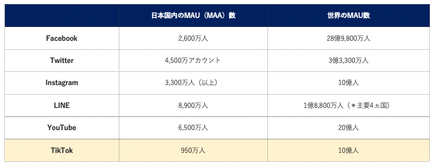 全世界ではInstagramと並ぶMAU数となっていて、日本国内では他のSNSサービスに劣るものの爆竹の勢いでMAU数を伸ばしています。