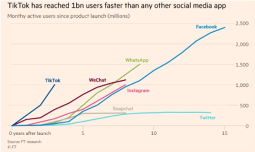 実際、上記図の通りにFacebookやInstagramが1億人を突破する半分の期間でTikTokは1億人を突破しています。